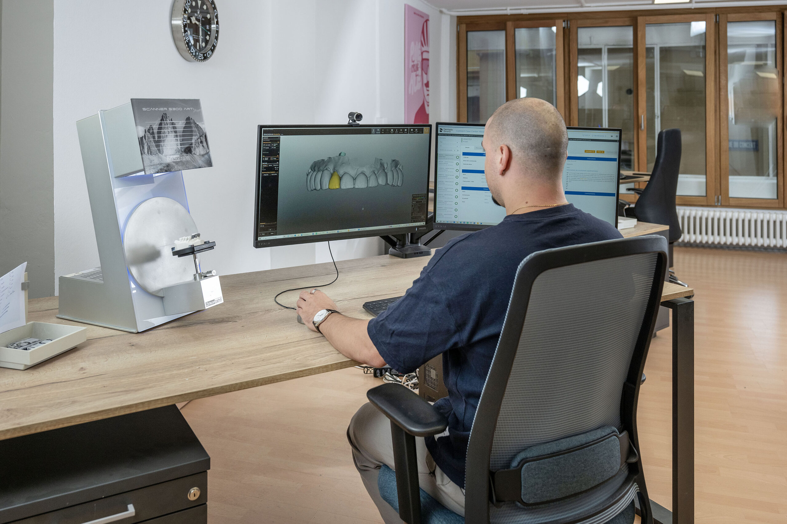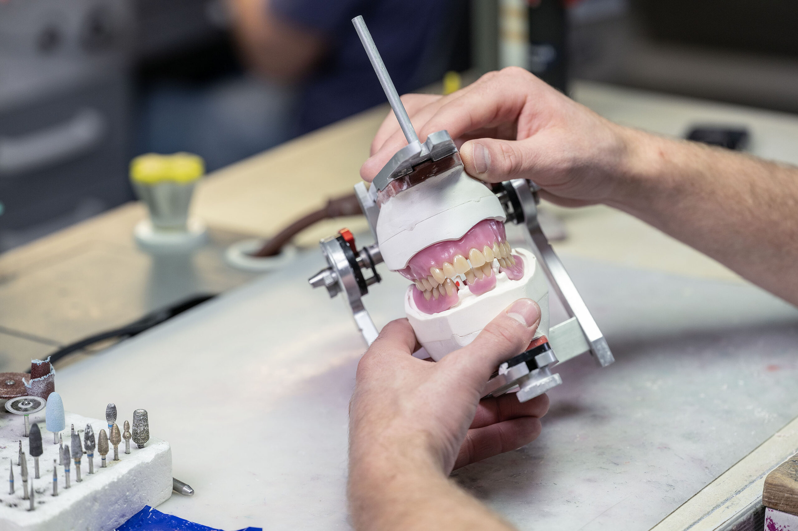 Pour les molaires et les dents postérieures, une dent peut être façonnée dans une zircone pré-teintée, puis personnalisée par peinture. Pour une incisive, l’exigence esthétique impose un travail plus fin : on utilise alors une stratification.