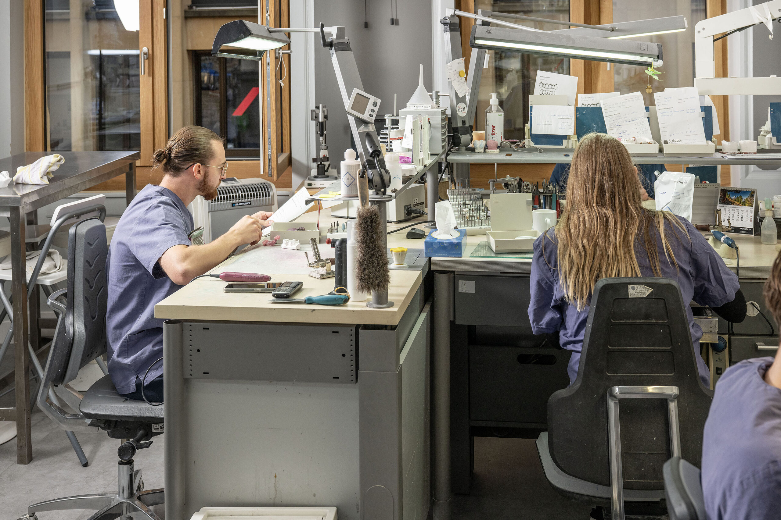 Vient ensuite la phase de caractérisation : ajout de petites touches blanches, ajustement d’une pointe de cuspide, zones bleutées, nuances jaunes… Ces détails relèvent de la sensibilité artistique du technicien. Certes la technique s’apprend, mais le rendu final dépend toujours du coup d’œil et du talent de l’artisan.